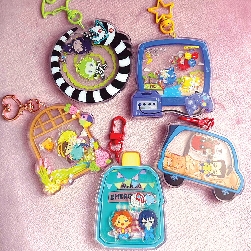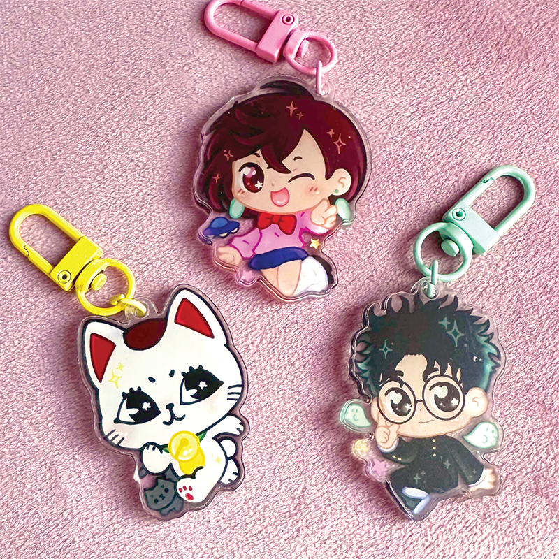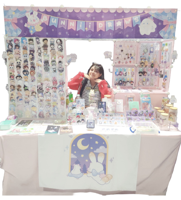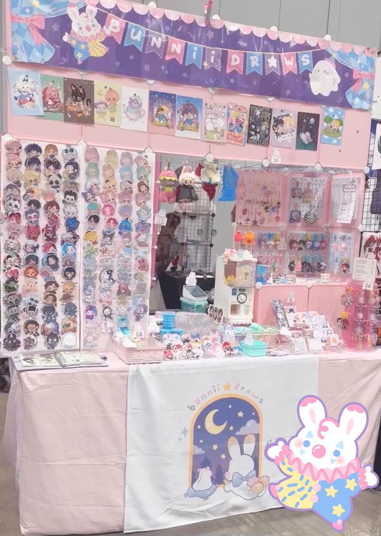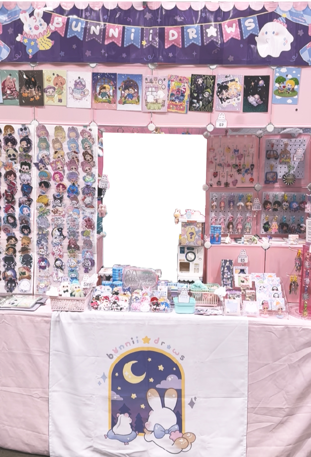 I specialize in creating stickers inspired by pop culture, horror, video games, and Japanese fandoms 𑣲 I love turning creepy things into something irresistibly cute! My booth features over 1OO unique sticker designs, about half of which are my own original art, with the rest being fan art ₍ᐢᐢ₎Beyond stickers, my merchandise includes an ever-growing variety of charms, keychains, and stationery such as sticker notebooks and journals. Recently, I’ve also started crocheting accessories, clothing, and plushies ૮꒰˶ ❛ ˕ ❛˶꒱აMy mom always bought me cutesy Sanrio goodies. Some of my happiest memories are walking into shops and looking at all the cute characters and designs. Now, I create art to share that same joy... to make people smile with my silly doodles. Seeing someone light up because of my art fills my heart with so much joy ˚ʚ♡ɞ˚